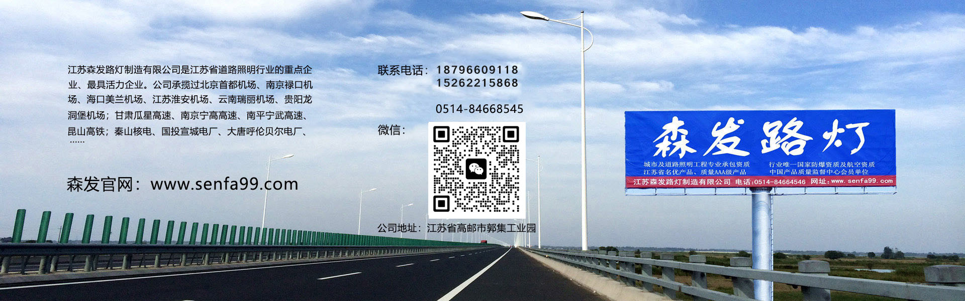 江蘇森發路燈制造有限公司是江蘇省道路照明行業的重 點企業。公司承攬過北京首都機場、南京祿口機場、海口美蘭機場、江蘇淮安機場、云南瑞麗機場、貴陽龍洞堡機場、珠海金灣機場、贛州黃金機場、江蘇新沂機場;甘肅瓜星高速、南京寧高高速、南平寧武高速、福建韶光高速、天津薊汕高速、貴州安江高速、昆山高鐵;秦山核電、福建霞浦核電、國投宣城電廠、大唐呼倫貝爾電廠、大唐803電廠、邵陽寶慶電廠、蘇州望電電廠、安徽廬江電廠、長治王曲電廠、國電湖北漢川電廠;福建莆田港、山東蓬萊港、江蘇太倉港、唐山曹妃甸港;福建武夷山風景區、江蘇吳江東太湖風景區;塔里木油田油罐區、青海鹽湖集團、北京工業大學、武漢通用制造基地、黑龍江濃江農場、江西星火有機硅項目;及國內眾多城市道路亮化項目。